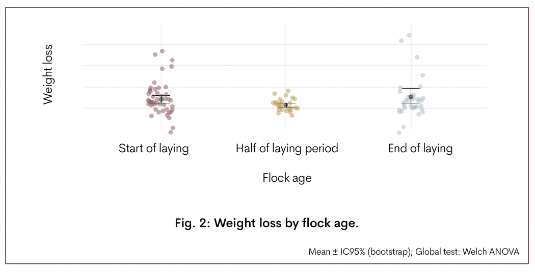 Une telle variabilité affecte directement la conductance de la coquille et l’homogénéité du poids des œufs, deux déterminants clés de la perte en eau durant l’incubation. Ainsi, même lorsque les valeurs moyennes de perte en eau semblent similaires entre les groupes d’âge, la fiabilité et la prévisibilité de la performance de la coquille diffèrent largement. Dans nos données, les troupeaux en pleine période de ponte produisaient des œufs présentant des valeurs de conductance plus resserrées et une taille plus homogène, ce qui se traduisait par des trajectoires de perte en eau plus stables et uniformes. À l’inverse, les troupeaux jeunes et âgés généraient des œufs de qualité plus variable, ce qui conduisait à une large gamme de taux de perte de poids. Ces résultats suggèrent que les responsables de couvoir devraient accorder une attention particulière à l’état physiologique des troupeaux reproducteurs en début et fin de cycle de ponte, périodes durant lesquelles la variabilité quotidienne peut être plus élevée malgré des performances moyennes comparables. Ce n’est donc pas tant l’âge parental en lui‑même, mais plutôt la stabilité physiologique du troupeau — façonnée par la gestion — qui semble déterminer la cohérence de la perte en eau durant l’incubation (Fig. 2). |