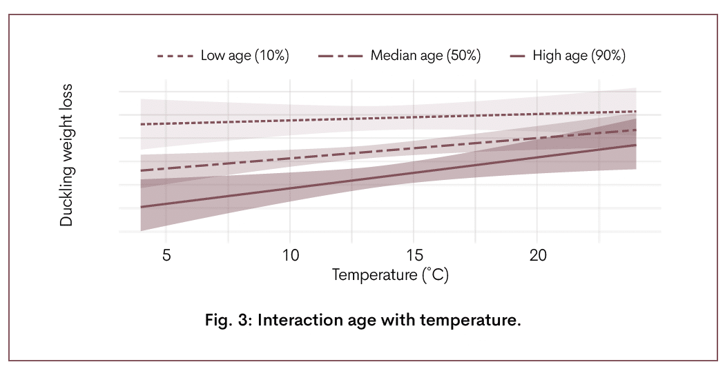 Ce retard peut persister jusqu’à l’éclosion, produisant des canetons légèrement plus lourds et donc plus frais, qui montrent à leur tour une perte de poids du caneton réduite. La température extérieure ambiante est apparue comme un autre facteur majeur : des températures extérieures plus élevées augmentaient généralement la perte en eau, probablement parce que les périodes chaudes en France s’accompagnent généralement d’un air plus sec. Un gradient hygrométrique plus important entre l’intérieur de l’œuf et l’environnement favorise la diffusion passive et accélère l’évaporation. Les précipitations, en revanche, avaient tendance à réduire légèrement la perte en eau, car une humidité ambiante accrue rétrécit ce gradient et diminue l’efficacité du transfert passif d’humidité. Au‑delà de ces effets principaux, deux interactions se sont révélées particulièrement informatives. La plus robuste était l’interaction entre l’âge parental et la température extérieure. Dans les troupeaux plus jeunes, des températures élevées augmentaient légèrement la perte de poids, ce qui est cohérent avec une atmosphère plus sèche lorsque la température augmente dans un climat tempéré. Cependant, dans les troupeaux plus âgés, l’effet de la température était amplifié en créant une pente plus raide. Cela suggère que les caractéristiques de la coquille et la taille des œufs en fin de cycle de ponte peuvent répondre différemment au stress environnemental (Fig 3.). |