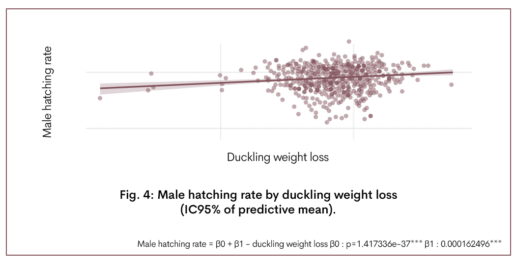 Une seconde interaction, bien que moins stable, a été observée entre la température extérieure et le poids initial de l’œuf : les œufs lourds exposés à des températures élevées présentaient des pertes de poids caneton disproportionnellement importantes, tandis que les œufs lourds en conditions plus fraîches perdaient beaucoup moins de poids caneton. Ces résultats soulignent que la température agit comme un modulateur majeur des dynamiques évaporatives, mais uniquement dans les systèmes où la ventilation est statique et donc sensible aux fluctuations climatiques extérieures. En effet, lorsque la température de la salle d’incubation diminue, les incubateurs doivent s’adapter à ce changement. Cela peut entraîner des variations dans les conditions environnementales à l’intérieur de l’incubateur et avoir un impact sur la perte de poids du caneton. En revanche, les systèmes à ventilation dynamique peuvent maintenir des conditions d’incubation stables tout au long de l’année, protégeant les œufs de la variabilité environnementale. Dans l’ensemble, nos résultats mettent en évidence l’interaction complexe entre la physiologie des reproducteurs, les caractéristiques des œufs et les conditions climatiques dans la détermination des pertes en eau en incubation commerciale du Mulard. Notre analyse finale a examiné la relation entre les performances d’éclosion (exprimées chez le canard Mulard comme le pourcentage de canetons mâles obtenus) et la perte de poids totale entre la mise en incubation et le moment où le caneton commercialisable est obtenu. |
